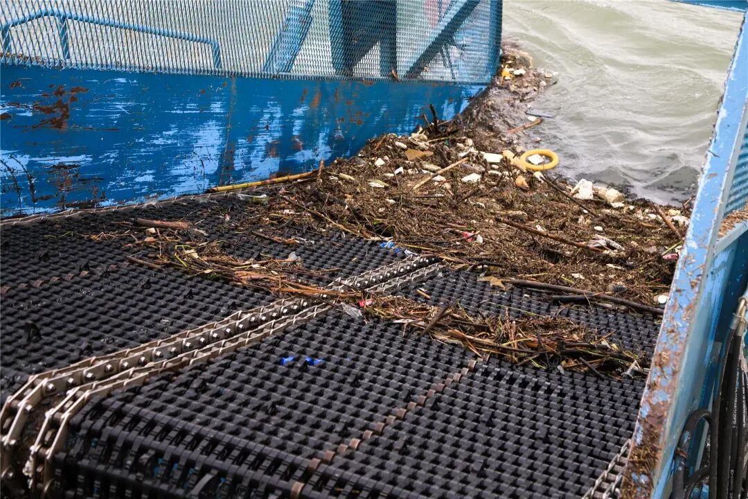 一艘機械清漂船在江面上來回穿梭