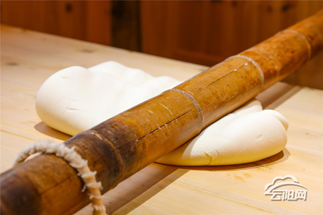 “巴陽山上的杠子面,壓呀壓成坨,世代永相傳吶,慢慢兒聽我說......”在“巴陽杠子面大師工作室”里,正傳出陣陣歌聲。巴陽杠子面非遺工坊第三十七代傳承人劉益在歡快的歌聲中,用竹杠反復壓制面團,他還詳細介紹著現在杠子面的每一個制作流程。