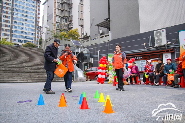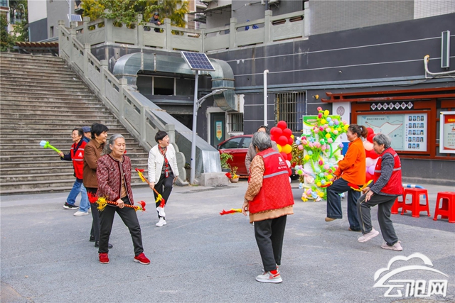 在雙江街道稻場社區廣場上,愛里養老院的12名老人與社區居民在歡快的音樂聲中,共同參與打蓮廂、做手勢舞《一抓一磞噠》。隨后,傳紙杯、套圈、有獎搶答等互動游戲接連上演,老人與居民搭檔上陣,現場笑聲不斷。