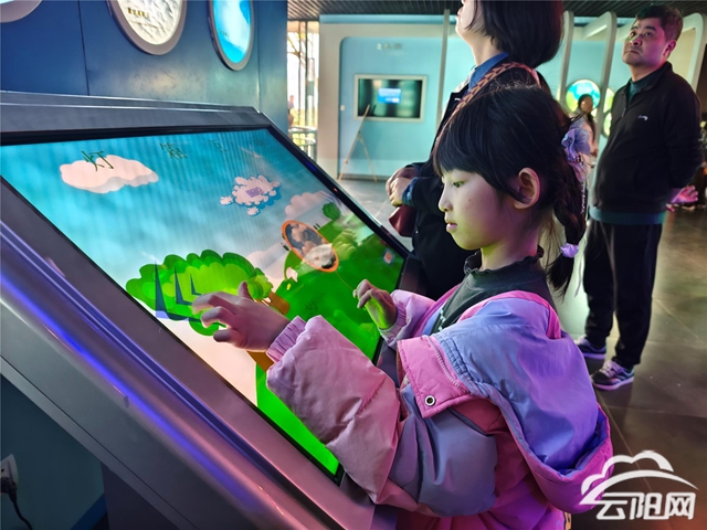 展館內互動體驗豐富多樣。在“觀云識天”展區,孩子們圍在觸摸屏前,爭先恐后地選擇自己感興趣的云的種類。隨著指尖輕點,墻上的燈箱隨之亮起,清晰展示出對應云層的真實影像,屏幕上還詳細介紹了云的名字、形態和形成原因。小朋友余濤興奮地說:“原來云還有這么多不同的名字,我以后也能看云識天氣了!”