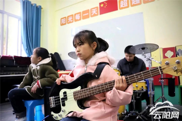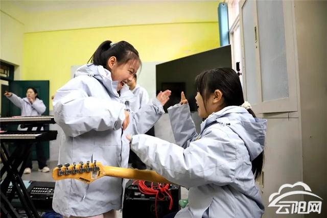 吉他手龔雨馨和貝斯手瞿欣悅,這對(duì)聽障姐妹花,是排練室里的“調(diào)皮二人組”。兩人聽不見(jiàn)聲音,卻總愛(ài)用手語(yǔ)“竊竊私語(yǔ)”,時(shí)不時(shí)對(duì)著老師做鬼臉,趁老師不注意就偷偷碰一下對(duì)方的琴弦,制造出一串雜亂的音符,然后捂著嘴偷笑。練習(xí)時(shí)偶爾會(huì)偷懶,手指放慢速度,眼神飄向窗外,被老師提醒后就吐吐舌頭,立馬認(rèn)真起來(lái);休息時(shí)最愛(ài)湊在一起玩玩具,分享小零食,像所有同齡女孩一樣,有著說(shuō)不完的悄悄話。瞿欣悅的奶奶說(shuō):“以前孩子因?yàn)槁牪灰?jiàn),自卑又內(nèi)向,現(xiàn)在加入樂(lè)隊(duì)后,每天都樂(lè)呵呵的,回家還會(huì)跟家人‘炫耀’自己的練習(xí)成果,調(diào)皮得很?!?/p>