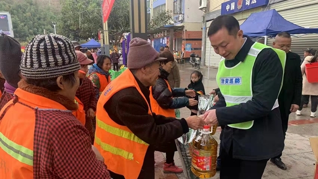 1月29日,在新春佳節即將來臨之際,平安鎮組成慰問組,看望慰問了辛勤工作在一線的環衛工人們,為他們帶去了米、油等春節慰問品,并致以新春的祝福。