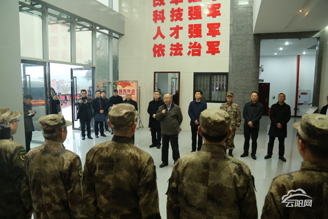 在縣人武部,官兵們精神飽滿、軍容整齊。張學鋒同官兵們親切握手,代表縣委、縣人大、縣政府、縣政協和全縣人民向駐云部隊全體官兵、民兵預備役人員致以新春的問候,向其家屬親人支持國防和軍隊建設表示衷心感謝。他說,近年來,云陽深學篤用習近平總書記視察重慶重要講話精神,全力打好“三大攻堅戰”,落實“八項行動計劃”,做好“五大重點”工作,經濟社會快速發展,人民群眾的獲得感、幸福感、安全感不斷提升,這背后離不開云陽駐云官兵的支持和保障。張學鋒希望大家要繼續發揚不怕疲勞、連續作戰的精神,堅守好崗位、履行好職責,繼續發揚敢打硬戰、敢于拼搏的精神,精誠團結、內強素質、外塑形象,做好人武部的各項工作,為云陽的社會和諧穩定、經濟發展做出新的貢獻。