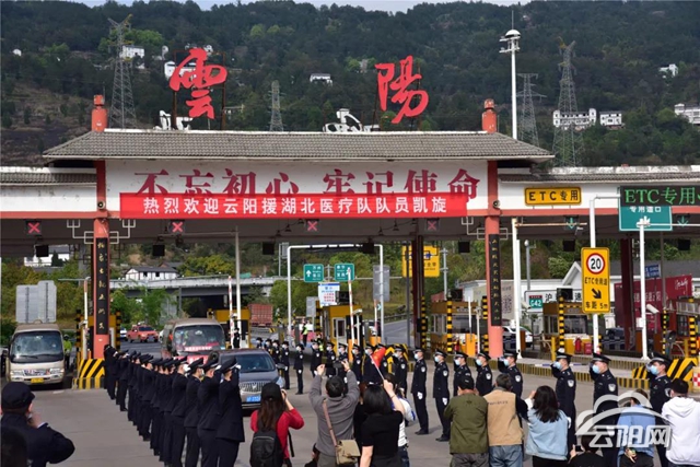 當天下午16時27分,載著12名“白衣戰士”的大巴車準點到達滬蓉高速云陽收費站出口。早已在高速出站口處列隊等候的公安干警齊刷刷地向醫療隊員敬禮致敬,用最崇高、最真誠的敬意,迎接援鄂的12名戰“疫”英雄凱旋。